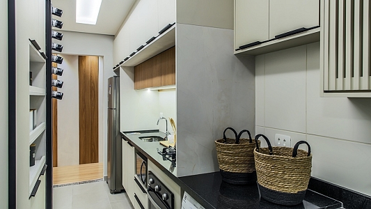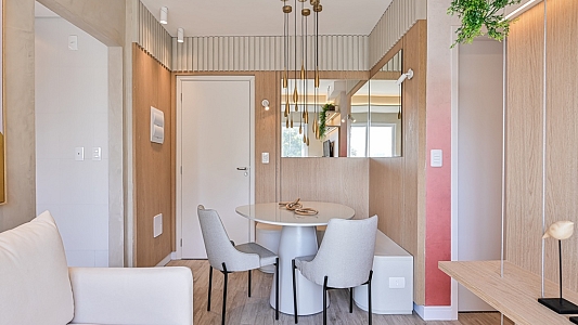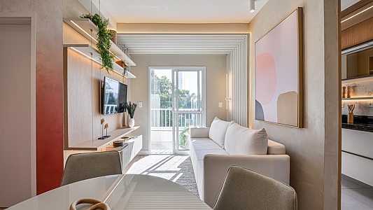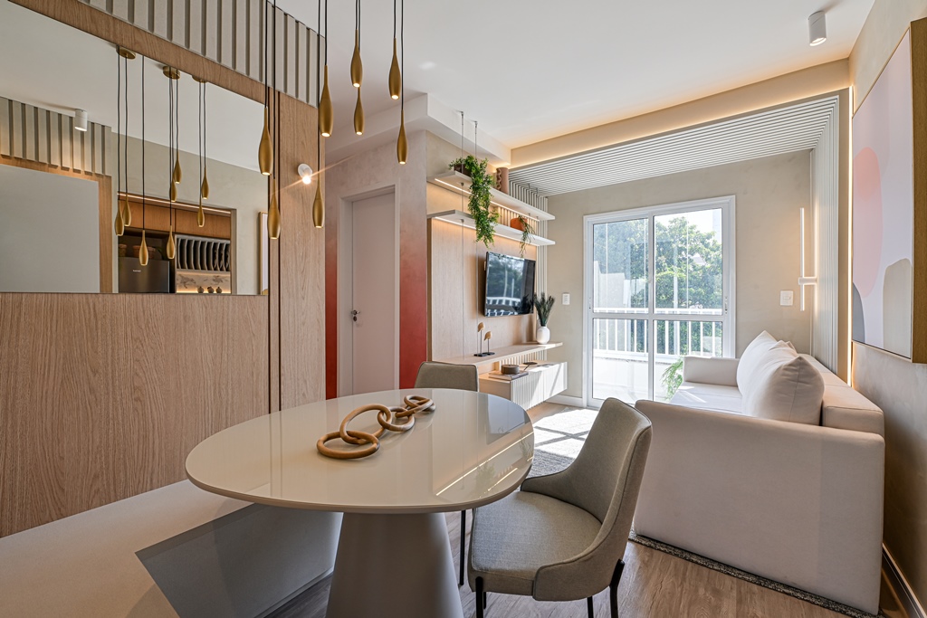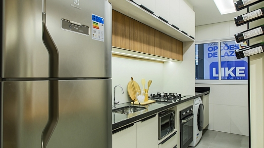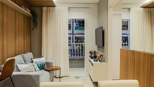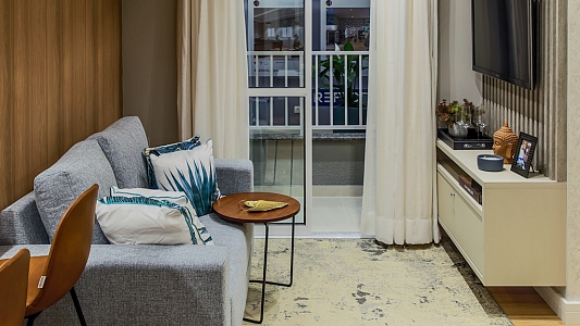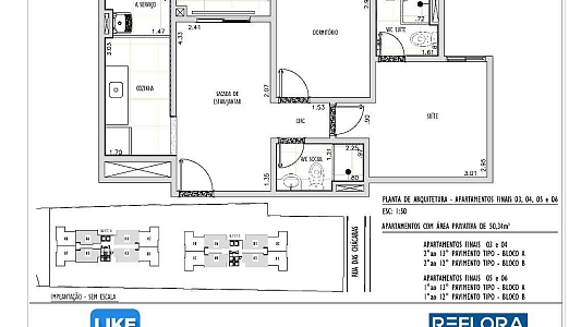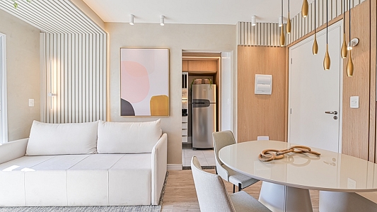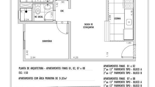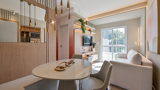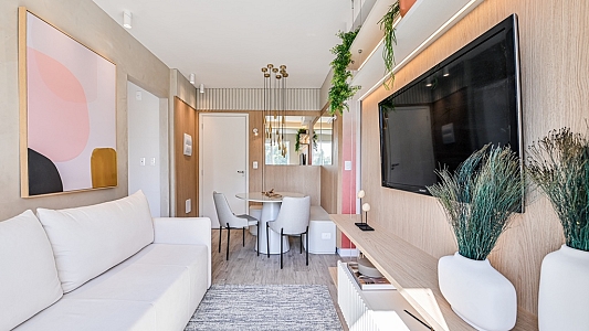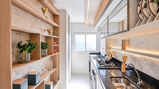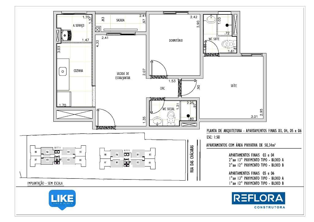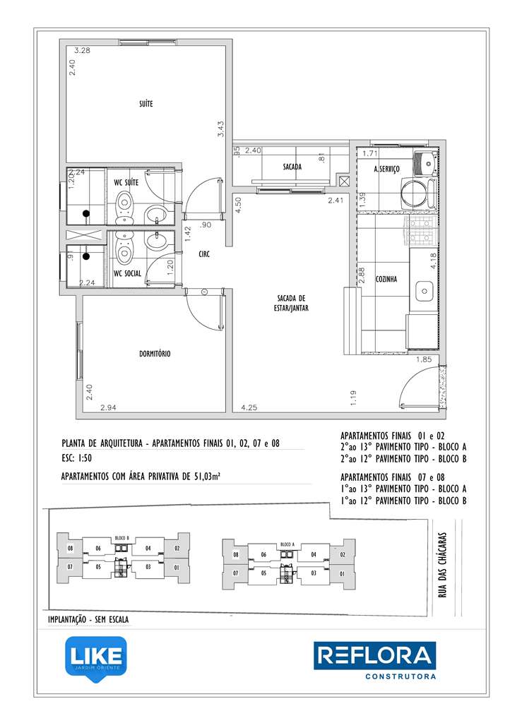 Apartamentos de 51,03m², com 2 dormitórios sendo 1 suíte, sala para 2 ambientes com sacada, cozinha, área de serviço, 1 vaga de garagem e hobby box no subsolo.