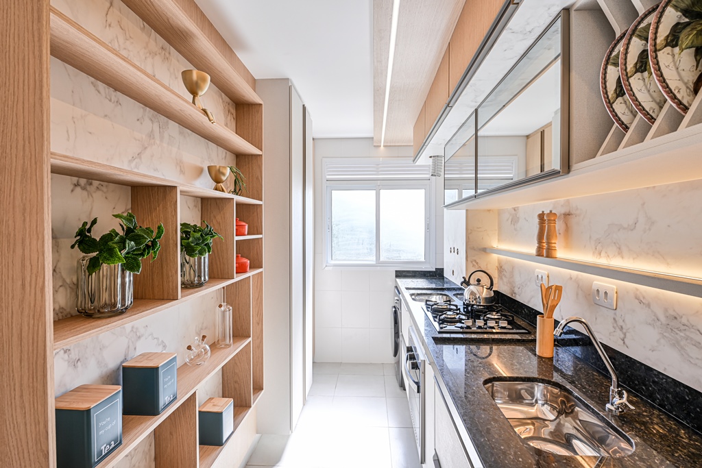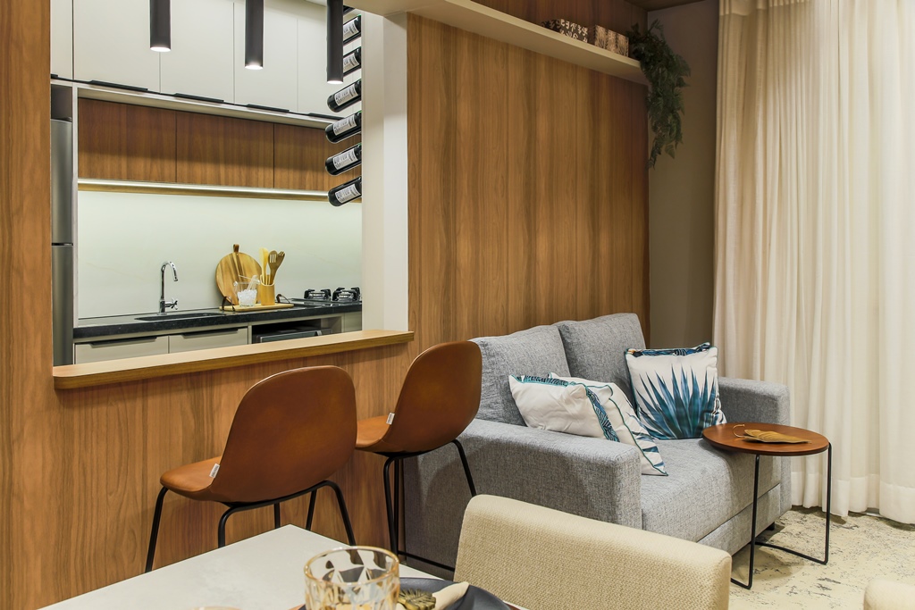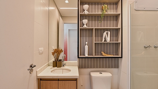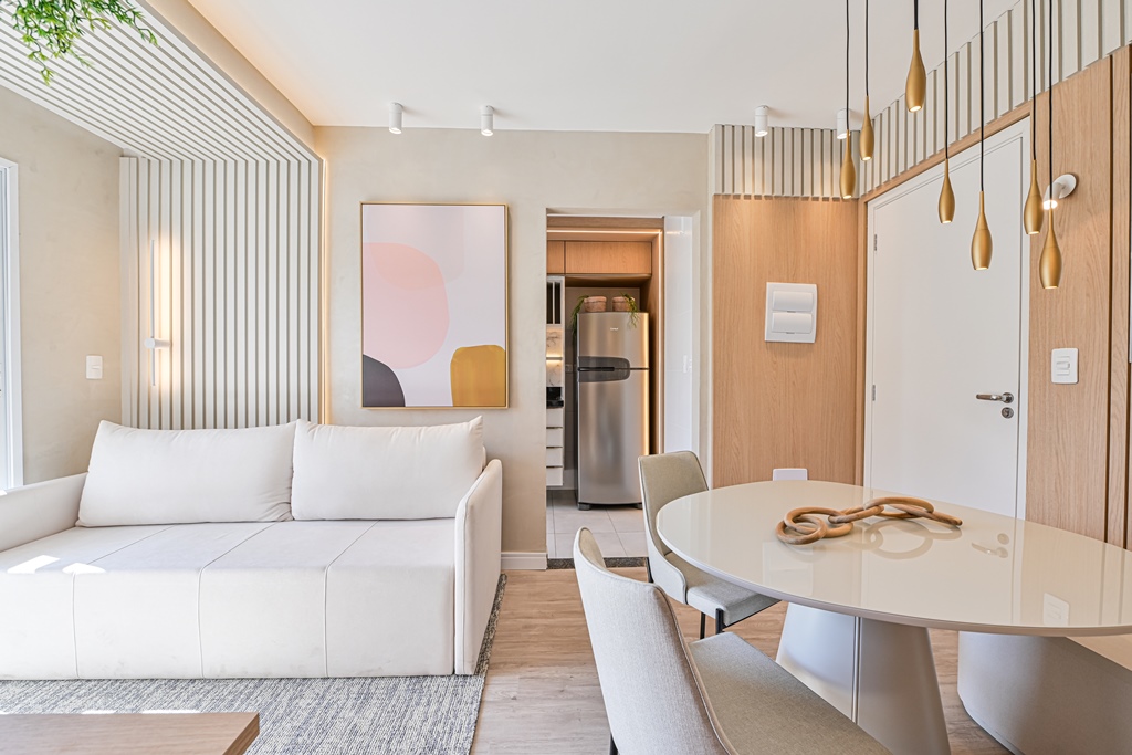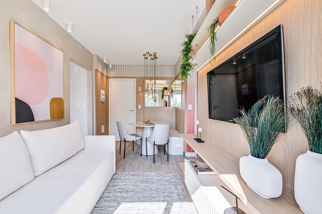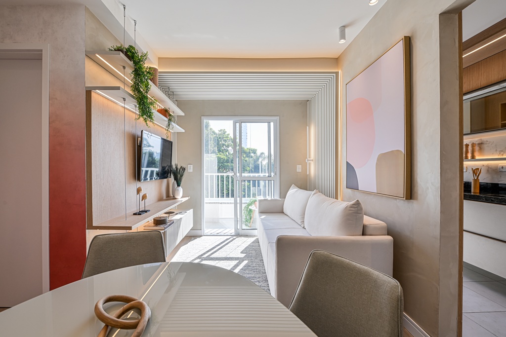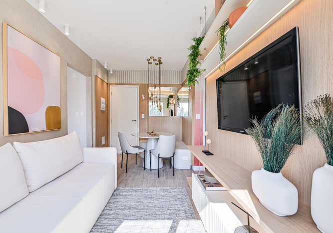 Apartamentos de 51,03m², com 2 dormitórios sendo 1 suíte, sala para 2 ambientes com sacada, cozinha, área de serviço, 1 vaga de garagem e hobby box no subsolo.