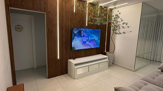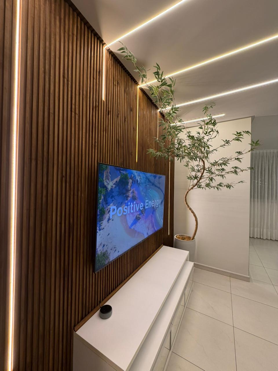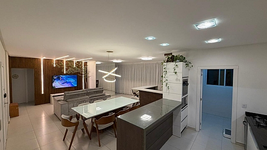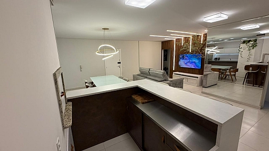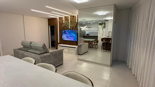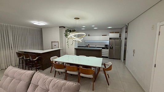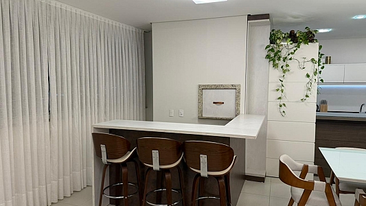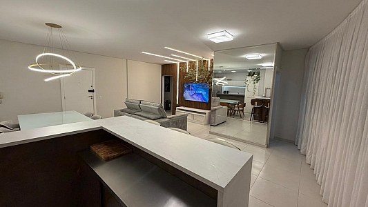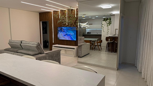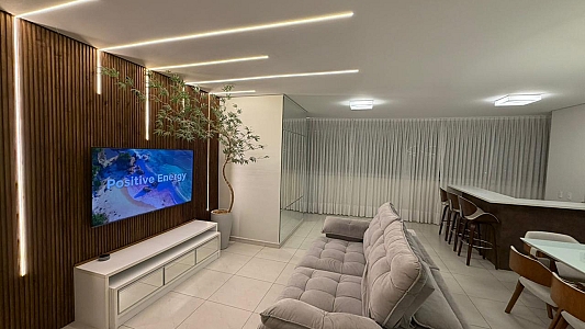 Social & Lazer: Living para 2 ambientes com iluminação em fitas de LED (intensidade controlável) e automação via Alexa. A sala de TV é um verdadeiro cinema particular, equipada com painel ripado, TV de 65” e sofá retrátil. A sala de jantar, com mesa para 8 lugares, é perfeita para receber convidados.