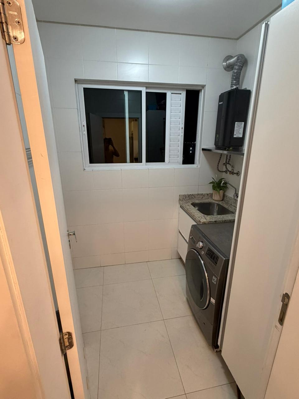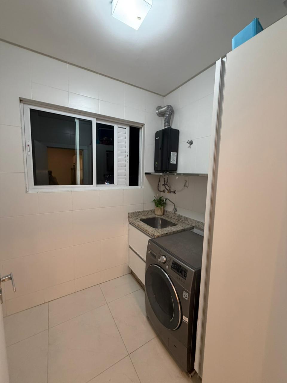 Praticidade: Lavanderia funcional com máquina de lavar e organização em inox.