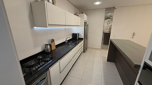 Gastronomia: Cozinha completa com eletrodomésticos de ponta (geladeira, air fryer, fogão a gás, forno elétrico, micro-ondas e lava-louças).
