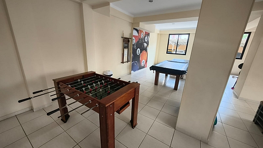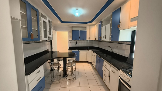 O apartamento é totalmente planejado e a cozinha grande oferece muita funcionalidade.