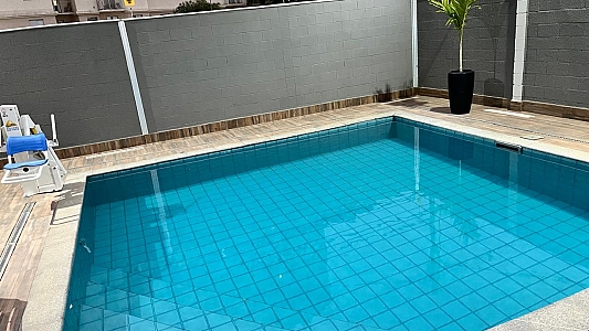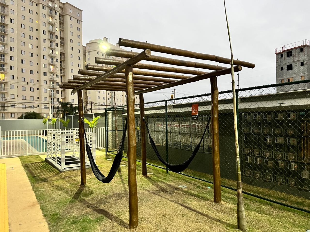 Condomínio com piscina, churrasqueira, espaço pet, redário e playground.