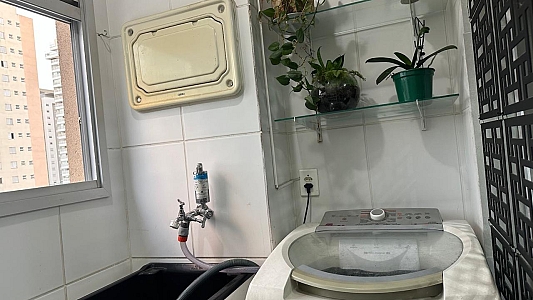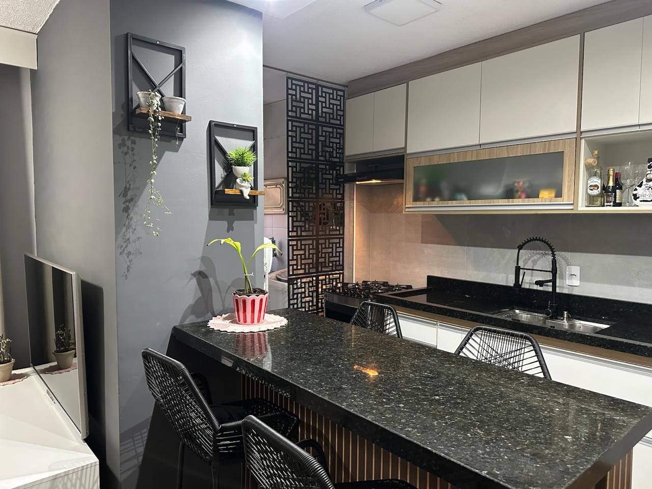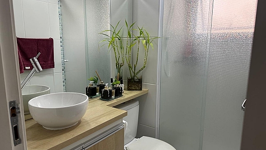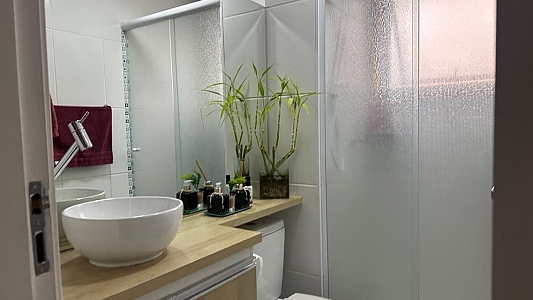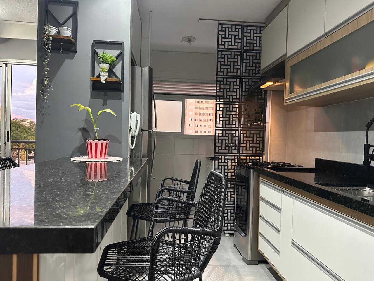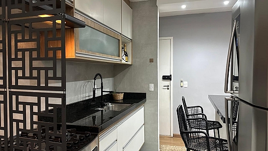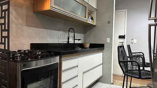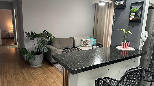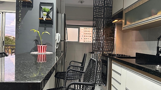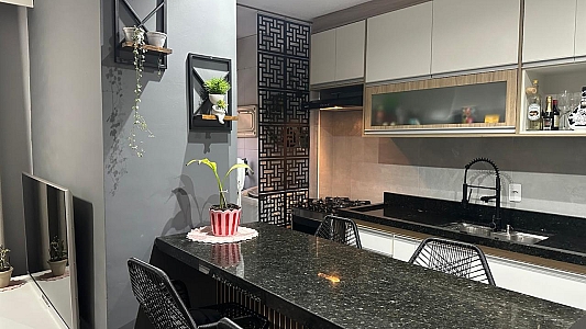 Dispõe de 2 dormitórios repletos de armários planejados, sala ampliada para dois ambientes com sacada e uma moderna cozinha americana planejada. O banheiro conta com box de vidro e gabinete, complementado por uma área de serviço funcional e 1 vaga de garagem coberta.