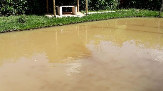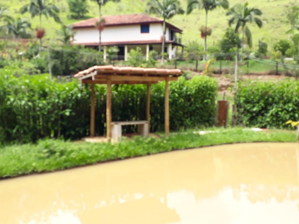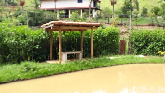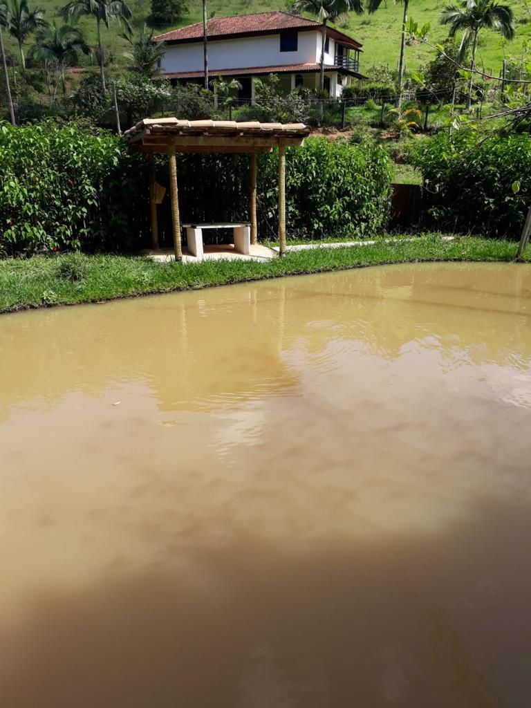 Lago com peixes, galinheiro com galinhas, pomar, horta, bica de água e nascente de água.