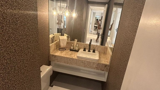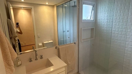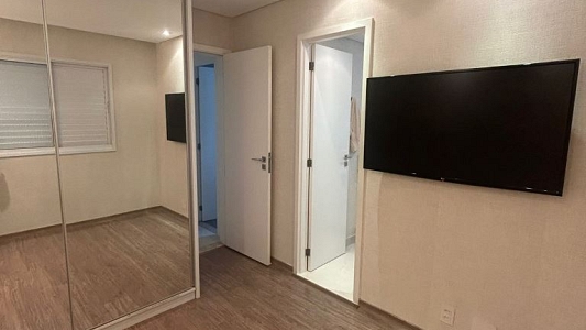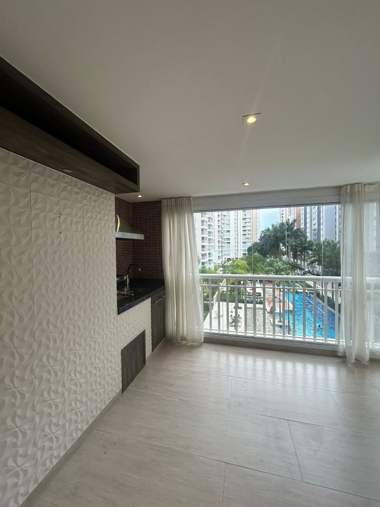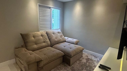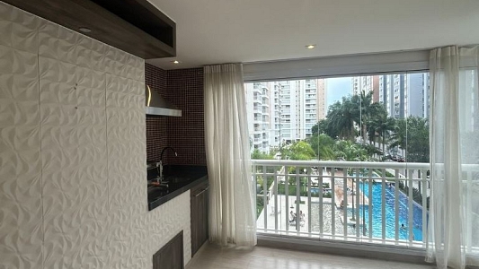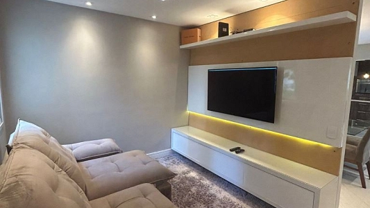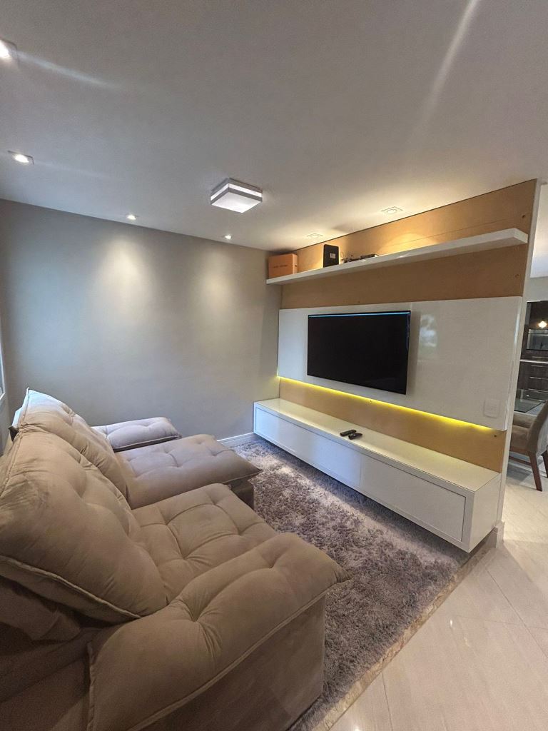 Apartamento de 90m², 2 dormitórios, sendo 1 suíte, sala de TV que pode ser revertida para o 3º dormitório, cozinha , planejados completos, eletrodomésticos embutidos e mesa de jantar, área gourmet ampla com vista livre para piscina do prédio, área de serviço separada da cozinha