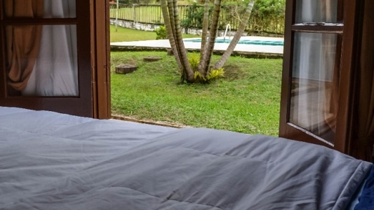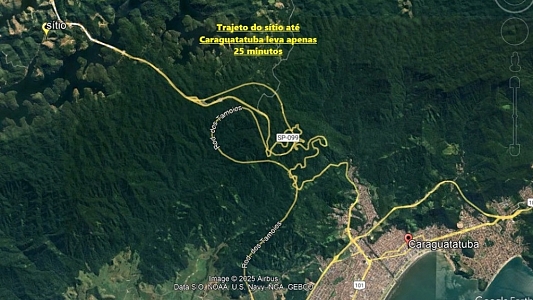 Localizado a 5 minutos do asfalto (Rodovia dos Tamoios) e 25 minutos da cidade e da praia (Caraguatatuba). Clima de serra, propriedade muito bem cuidada.