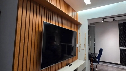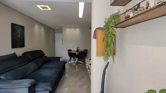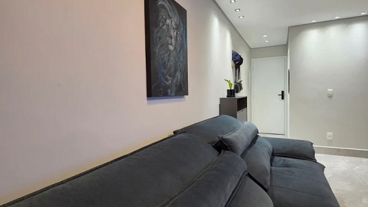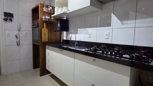 Apartamento de 75m², andar alto, com 2 dormitórios, sendo 1 suíte, com armários planejados e ar condicionado, sala para 2 ambientes e sacada com cortina de vidro, cozinha planejada com cooktop e coifa, área de serviço e 2 vagas na garagem.