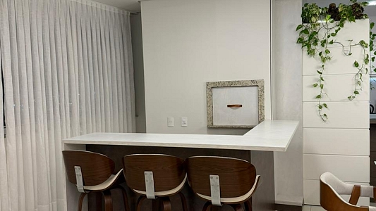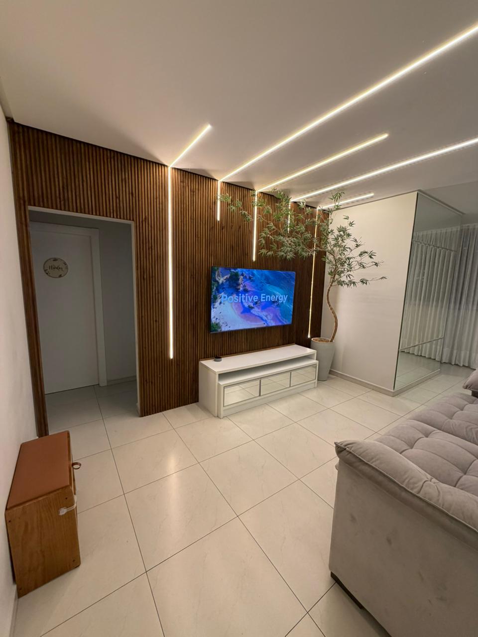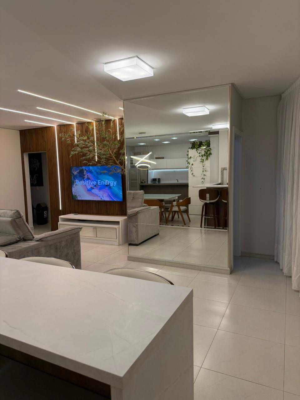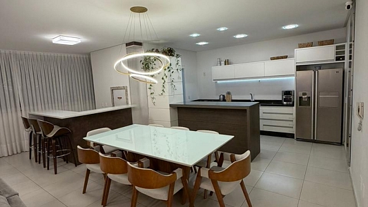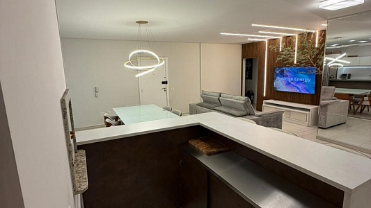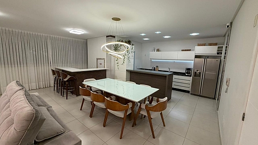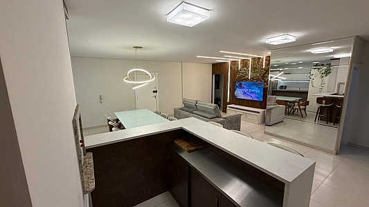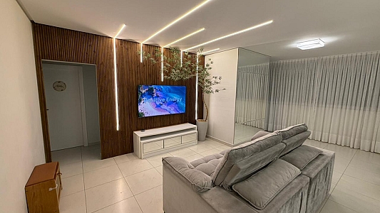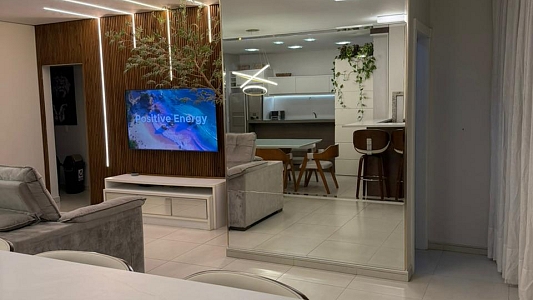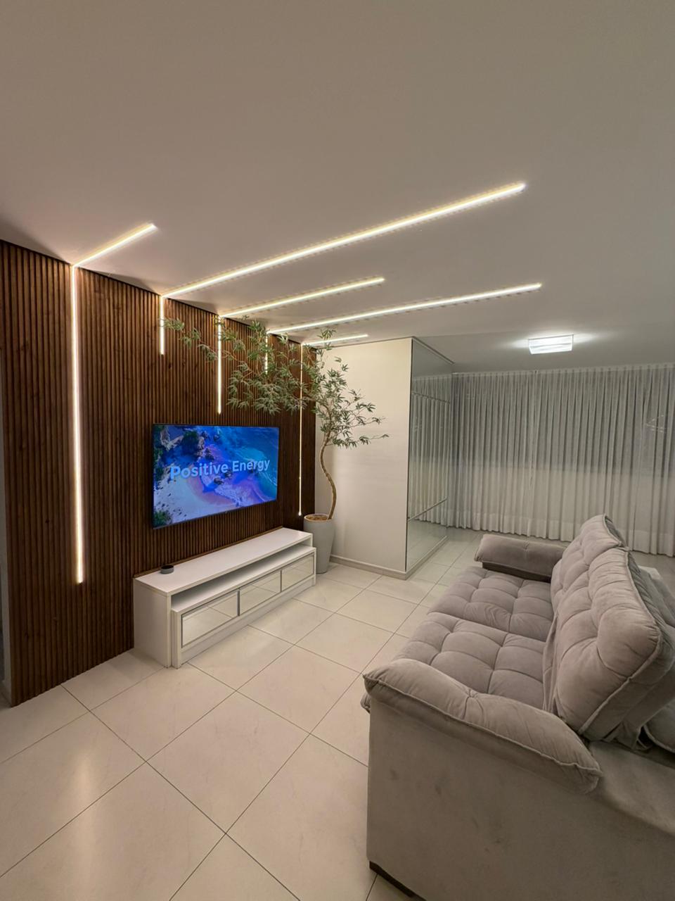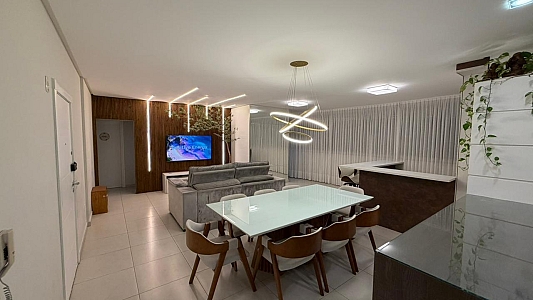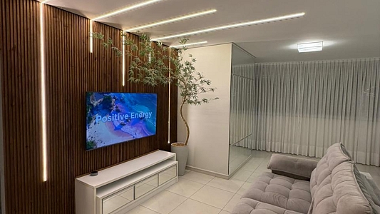 Social & Lazer: Living para 2 ambientes com iluminação em fitas de LED (intensidade controlável) e automação via Alexa. A sala de TV é um verdadeiro cinema particular, equipada com painel ripado, TV de 65” e sofá retrátil. A sala de jantar, com mesa para 8 lugares, é perfeita para receber convidados.
