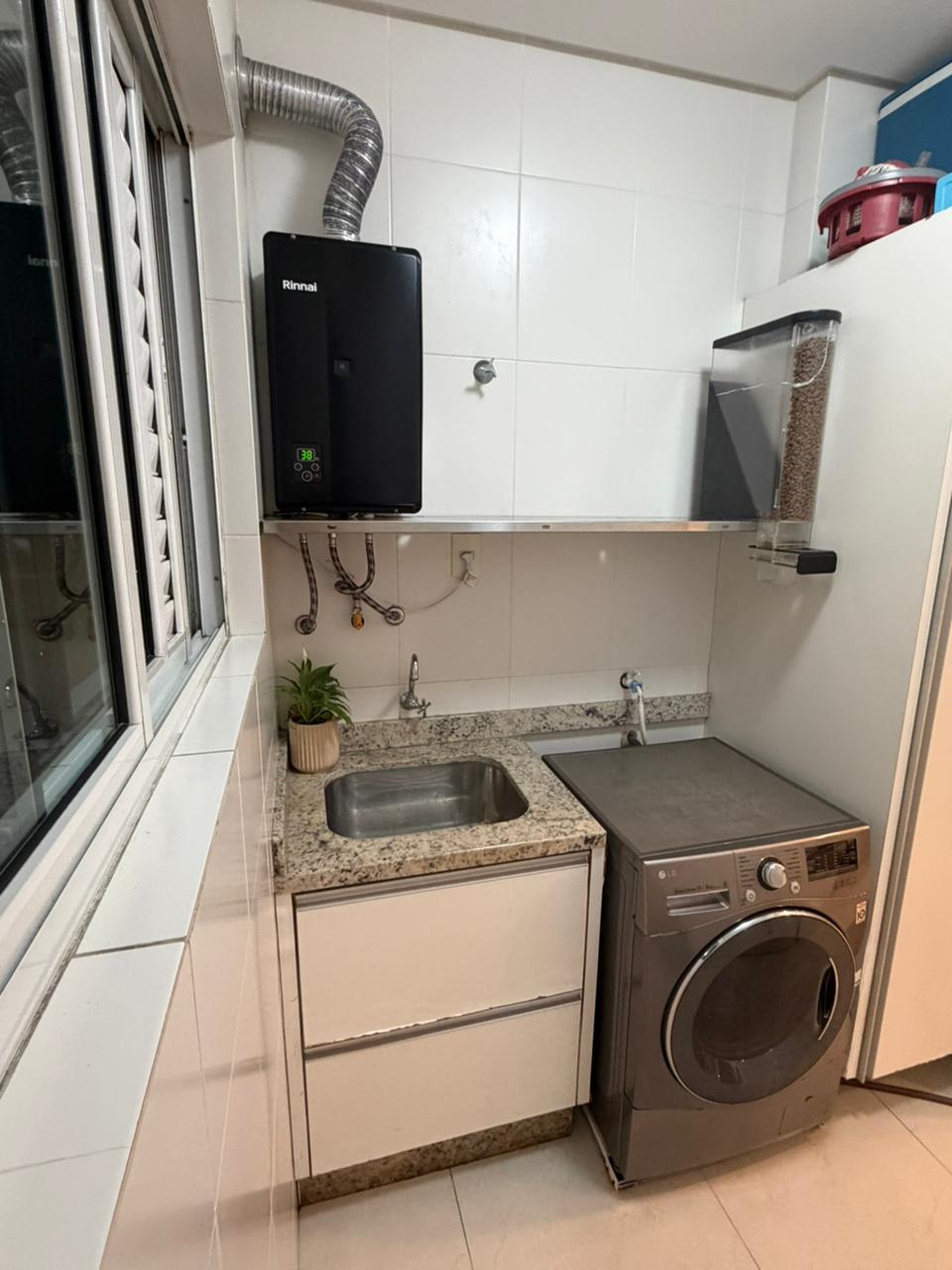 Praticidade: Lavanderia funcional com máquina de lavar e organização em inox.