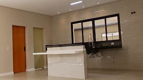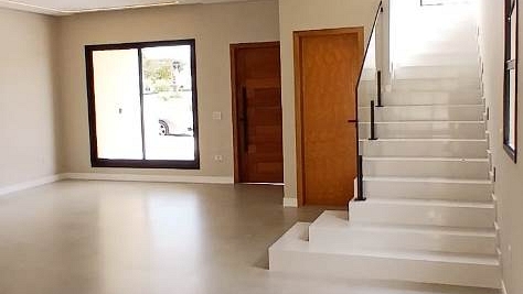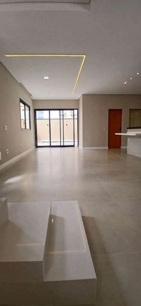 O piso inferior é a área social da casa, com sala de TV, sala de jantar, cozinha, lavabo, despensa e área de serviço, todos em um conceito de ambientes integrados.