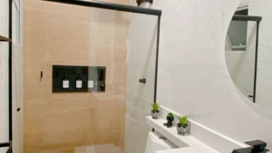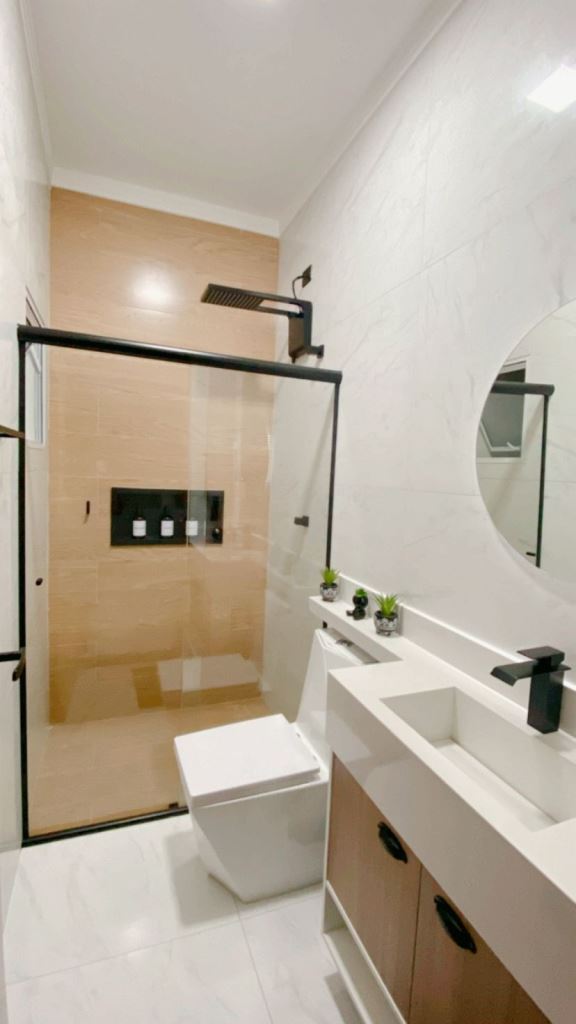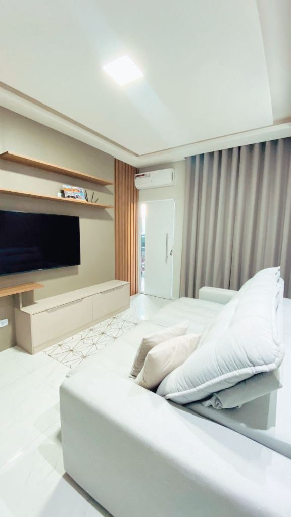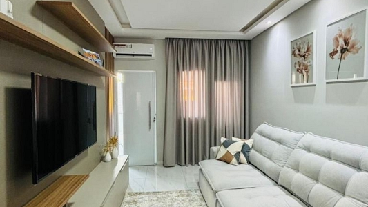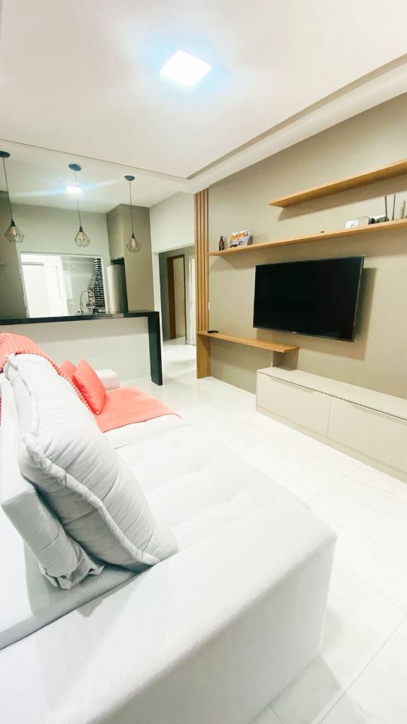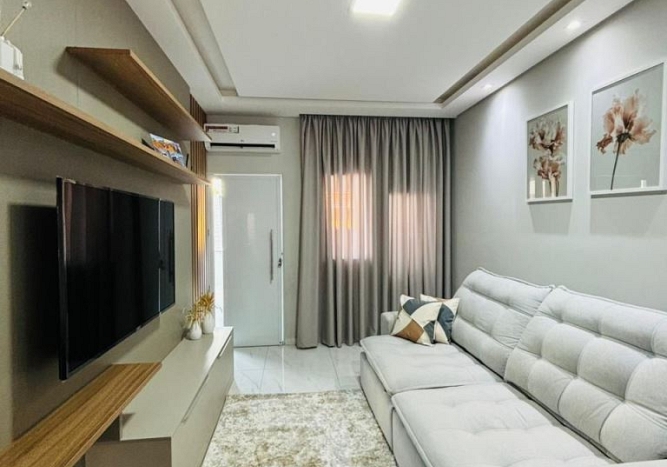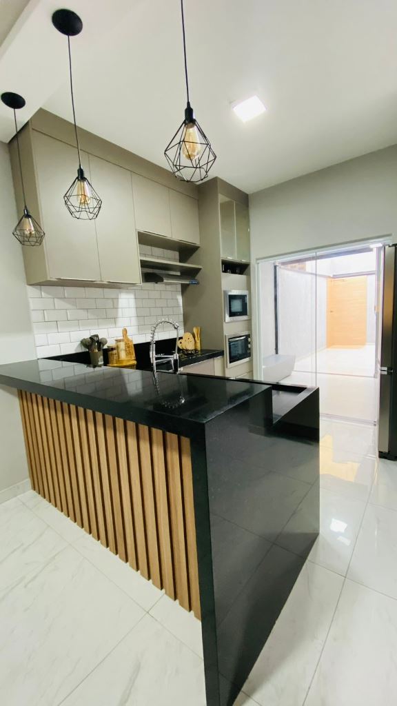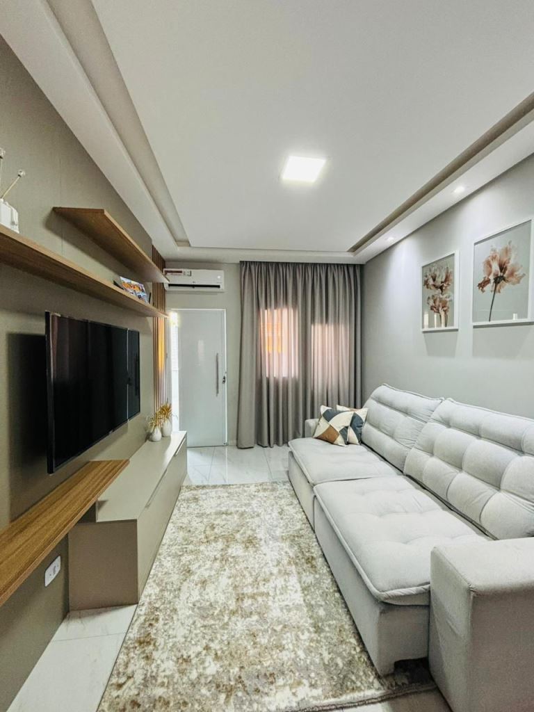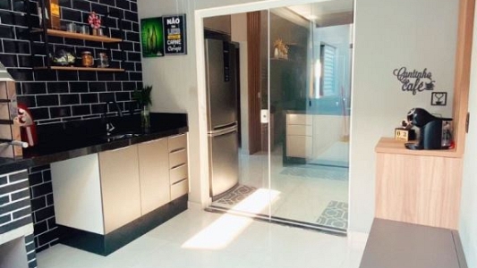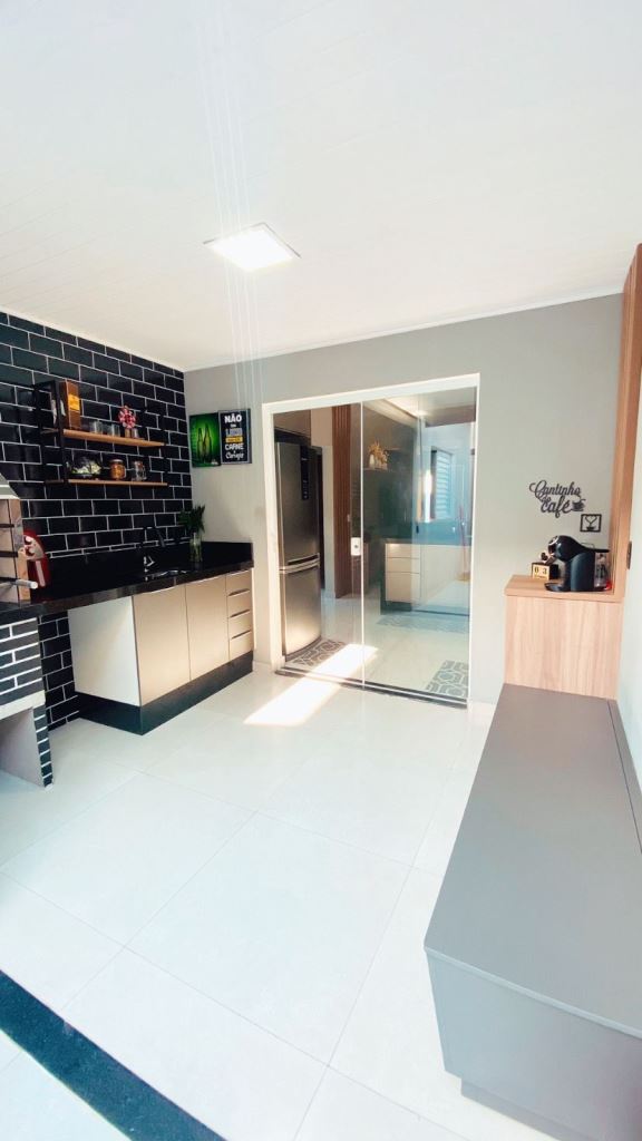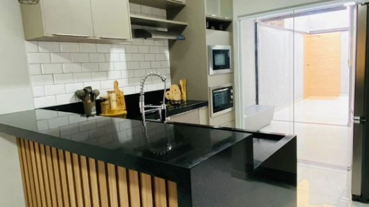 Casa térrea num terreno de 140m², área construída de 97,98m², com 3 dormitórios, sento 1 suíte, sala para 2 ambientes, cozinha americana, banheiro social, jardim de inverno e garagem para 2 carros. Àrea gourmet com churrasqueira.