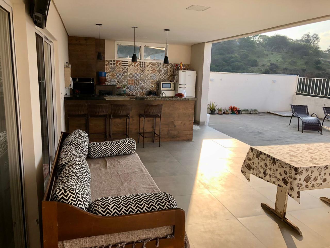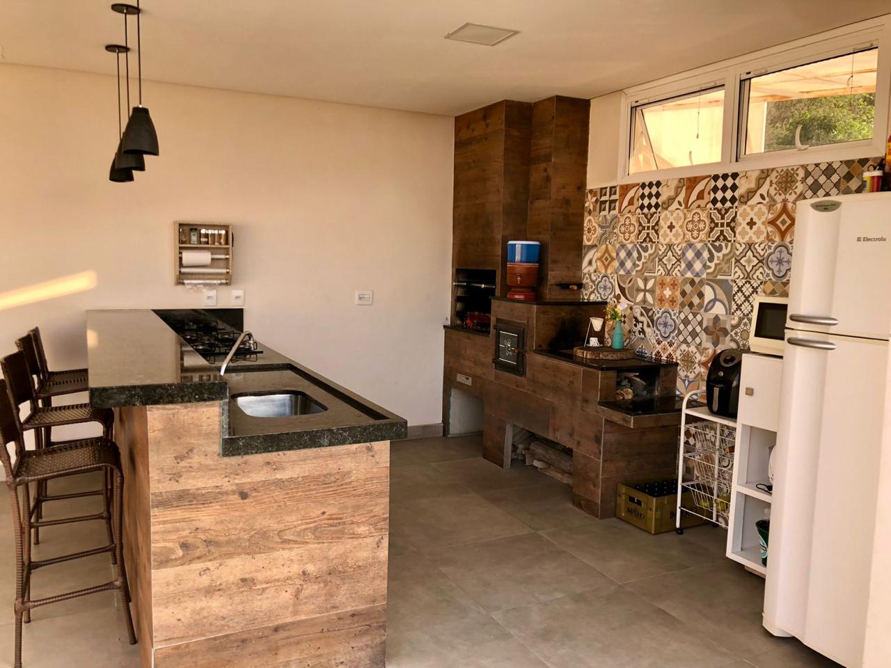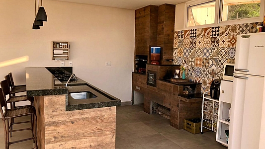 Conta com área gourmet completa, com churrasqueira e fogão a lenha, além de sacada com vista para área verde.