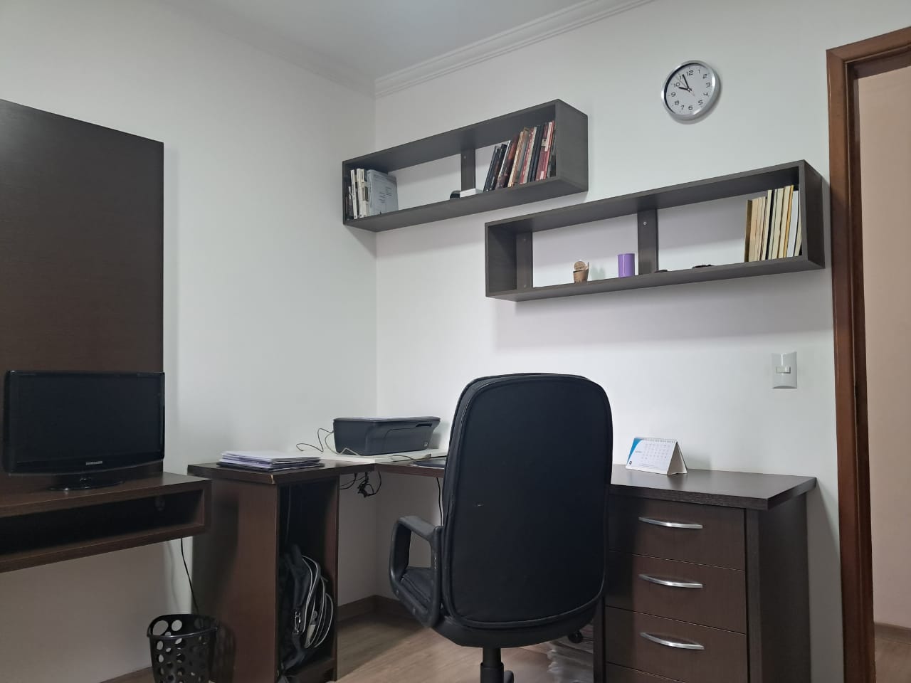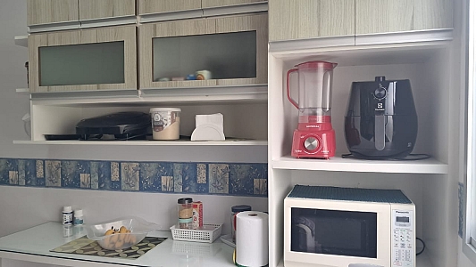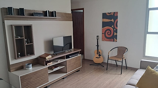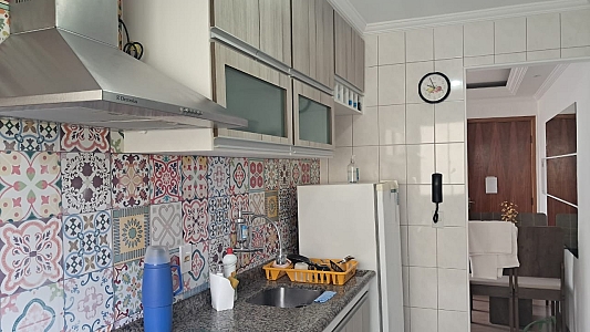 Destaques internos: 2 dormitórios repletos de armários planejados; sala ampla para dois ambientes com ventilador de teto; cozinha funcional com bancada, cooktop e coifa; área de serviço organizada e banheiro com box de vidro.