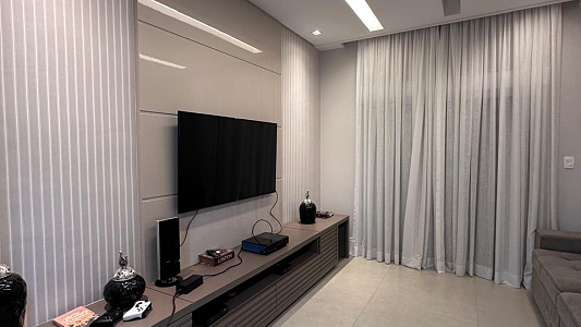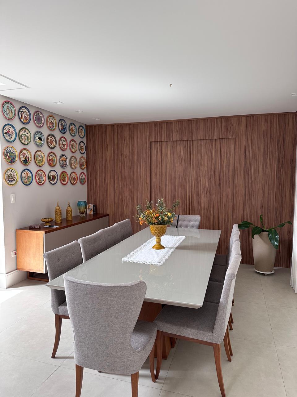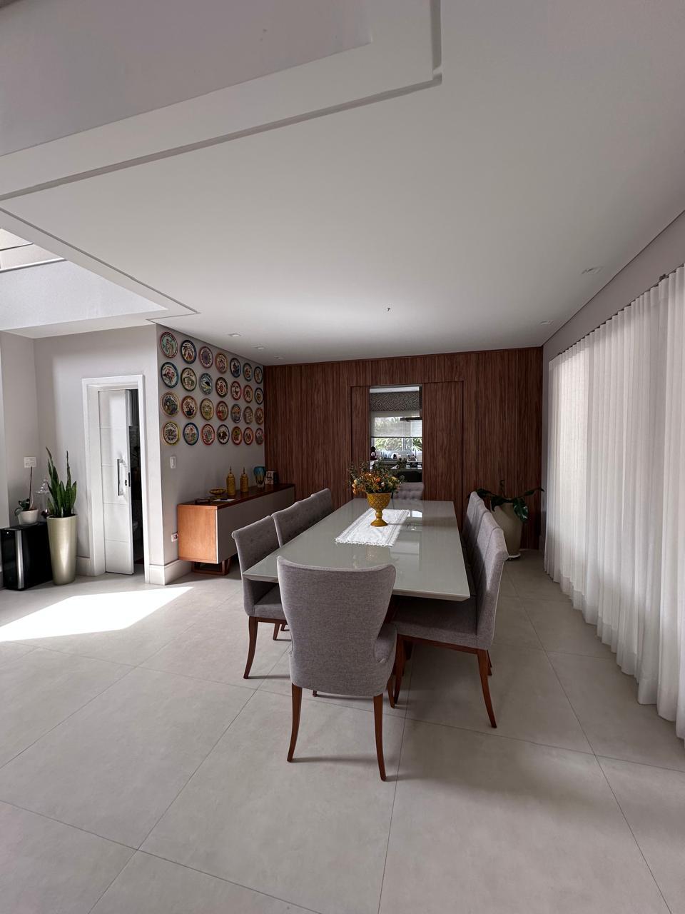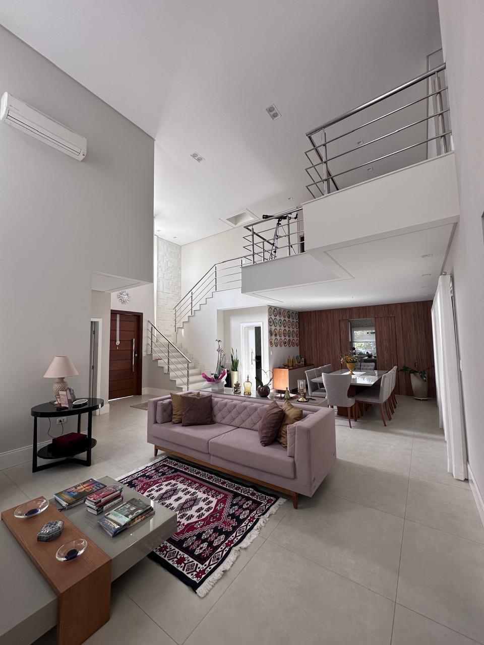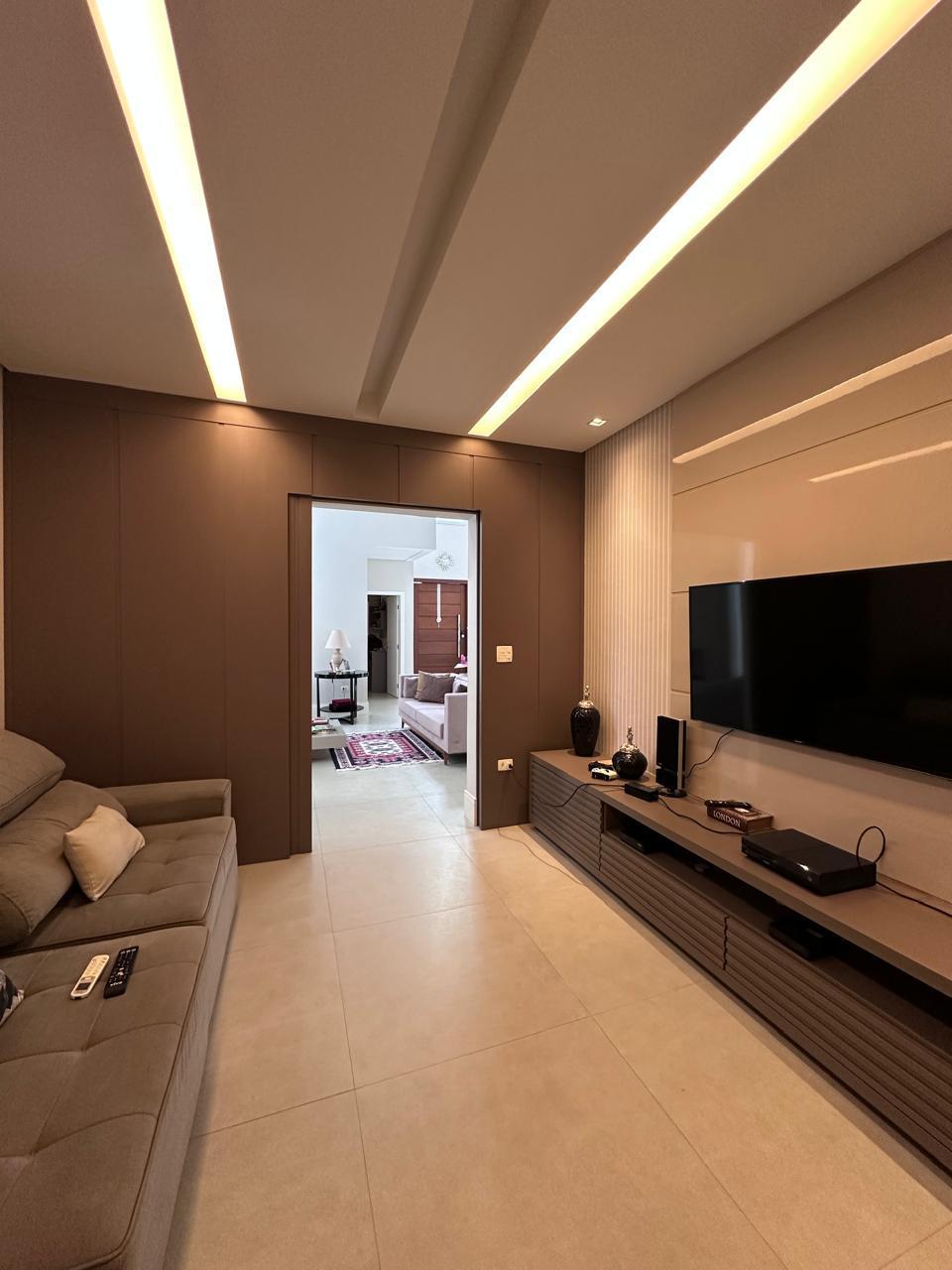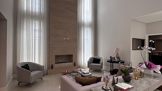 Espaços de Convívio: Ampla sala de estar com 3 ambientes e lareira, sala de TV climatizada e um lavabo social.