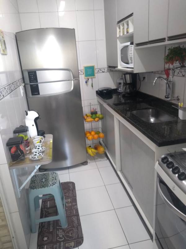 Conta com 2 dormitórios com armários embutidos, sala para 2 ambientes com painel de TV, cozinha planejada, banheiro social com armário, além de área de serviço com armário e vaga de garagem.