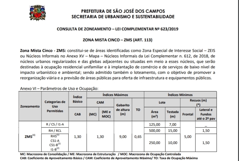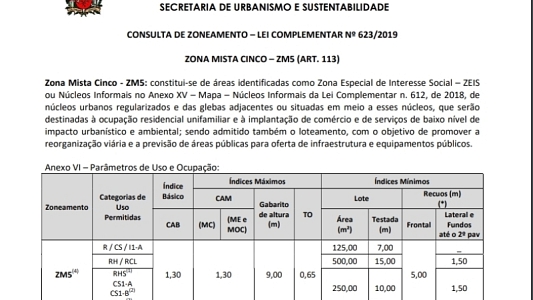 Classificado na nova Lei de Zoneamento como ZM-5, a área permite um alto potencial de aproveitamento construtivo.